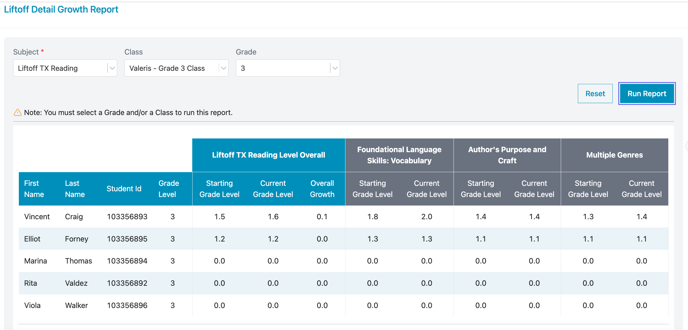 • Teachers can also view the individual activities completed by students within Liftoff, including scores and details.