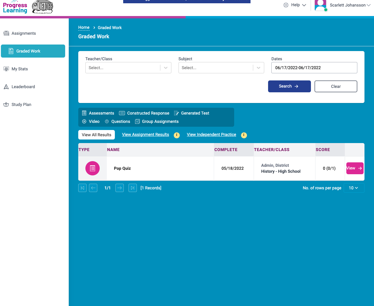 - Students have three tabs: View All Results, View Assignment Results, and View Independent Practice.
