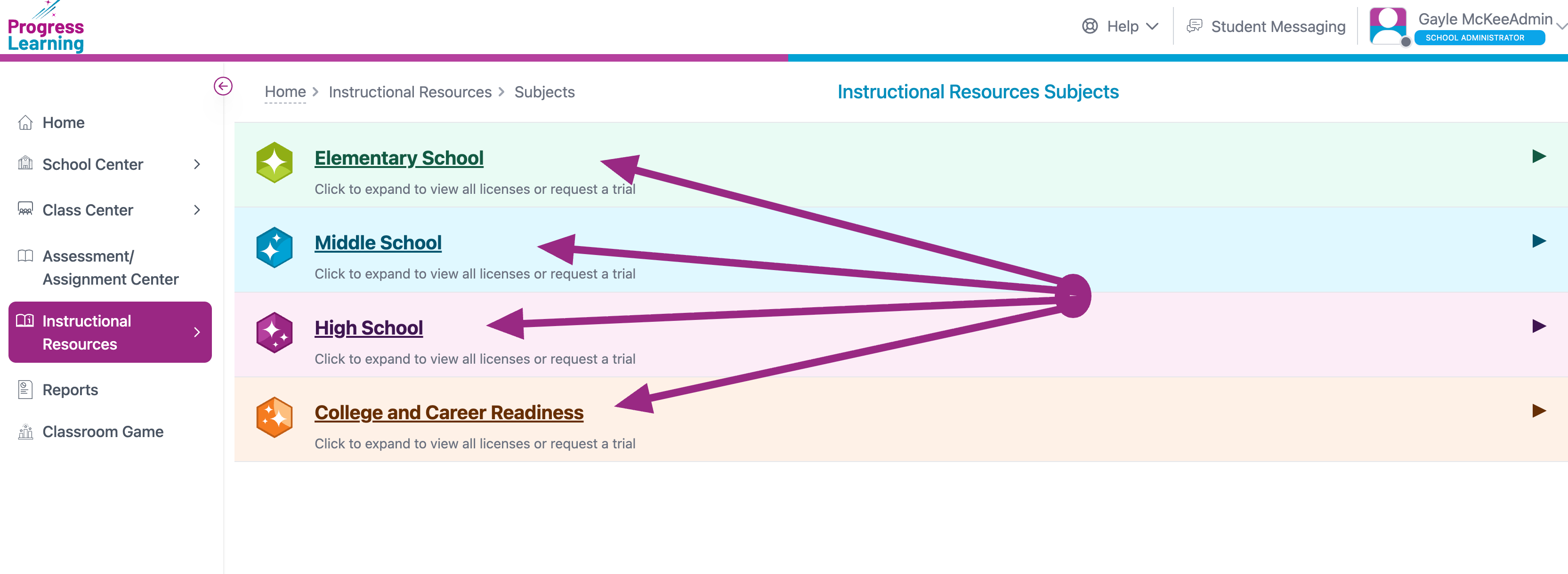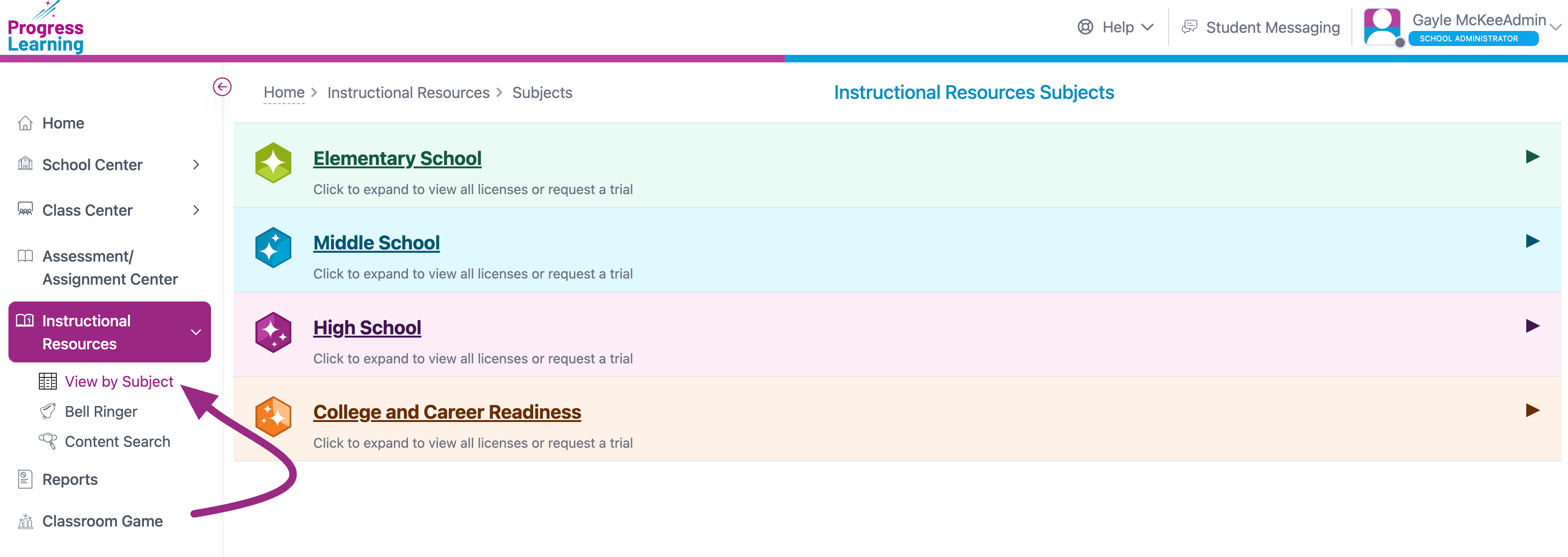 - From the menu on the left, navigate to Instructional Resources and click on View by Subject