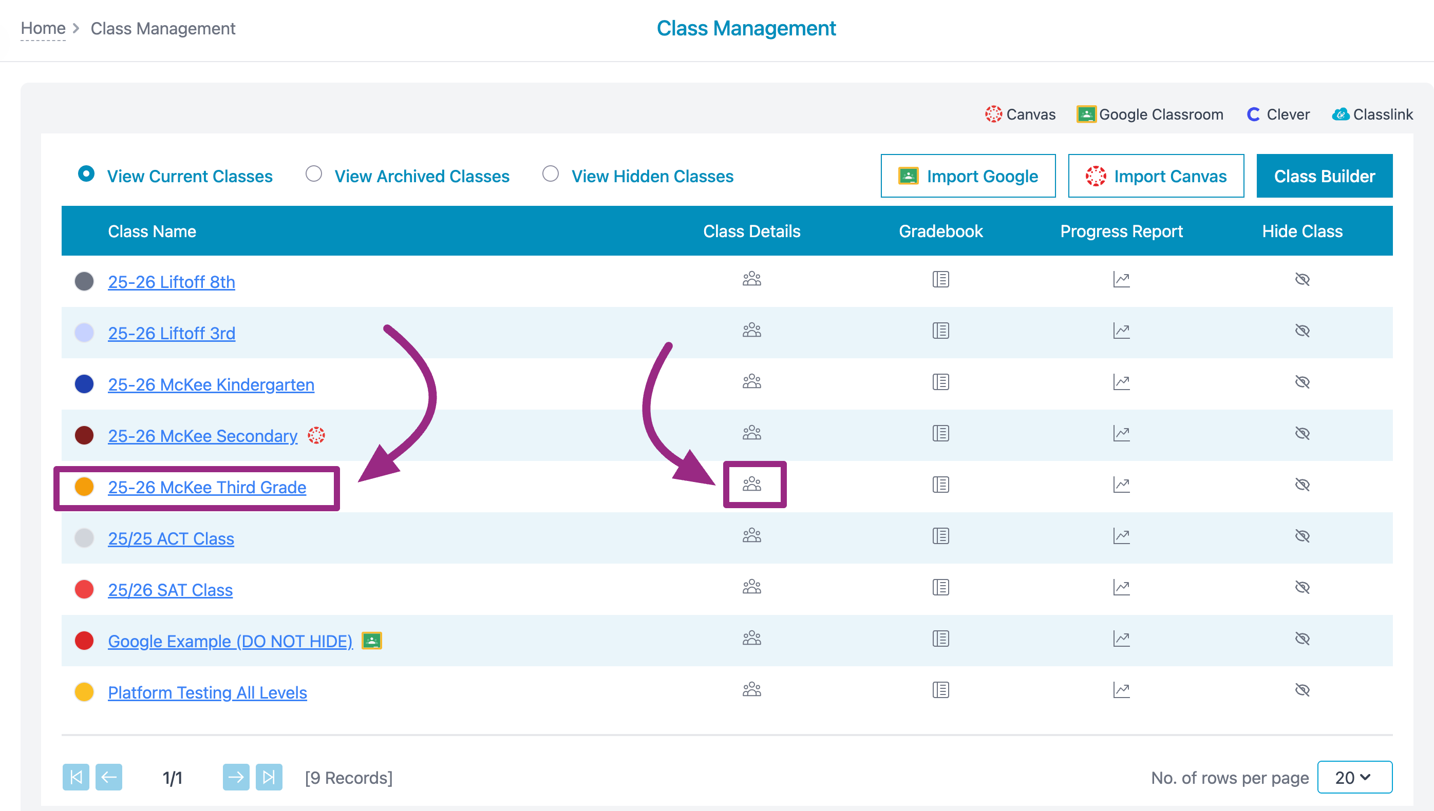 - Select a class from your class list by either clicking on the Class Name or the relevant icon under Class Details.
