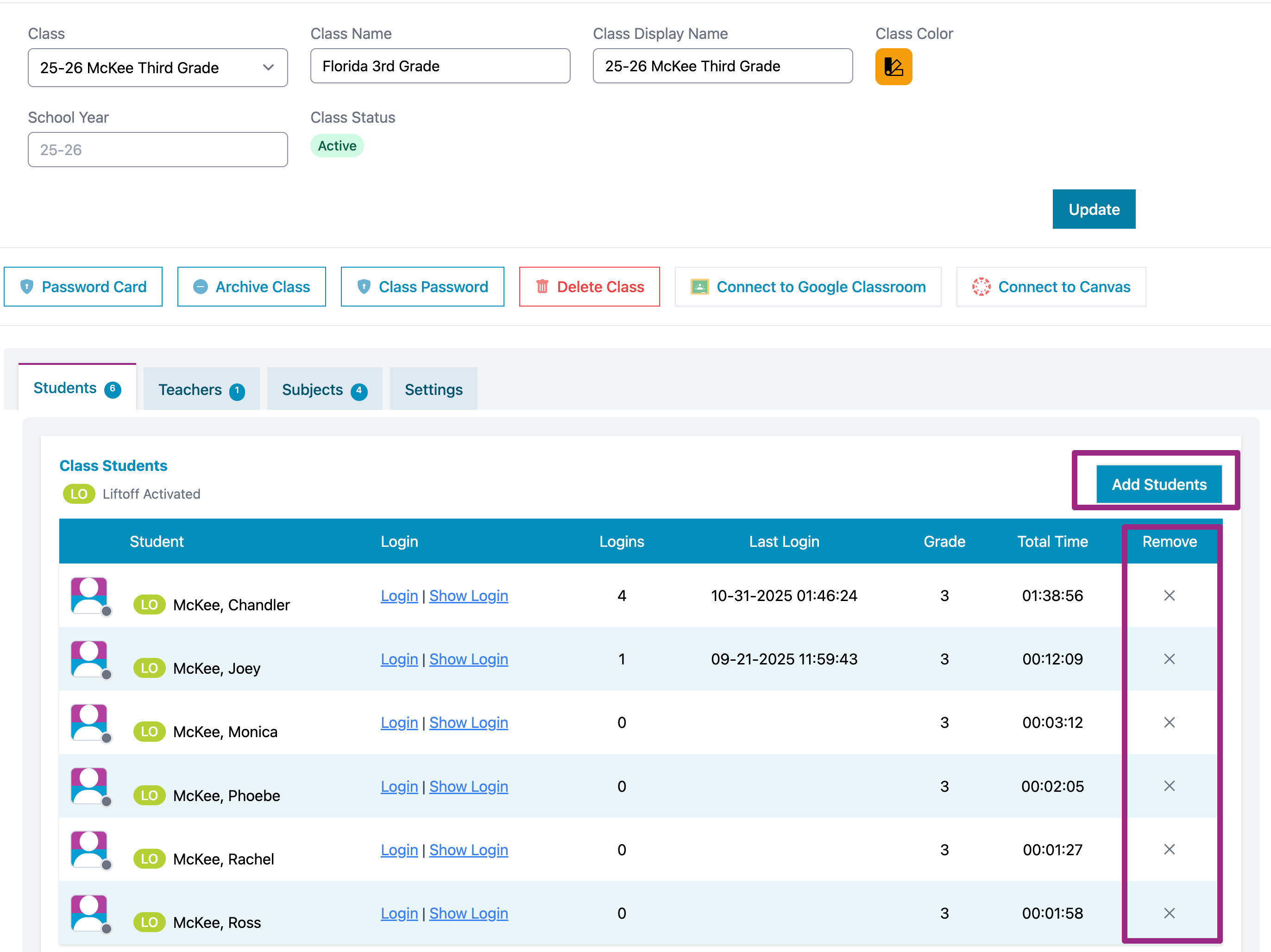 - To edit your students, you can click Add Students, to include more students to this specific class. You can also select the (x) next to a student's name to remove the student from this class.