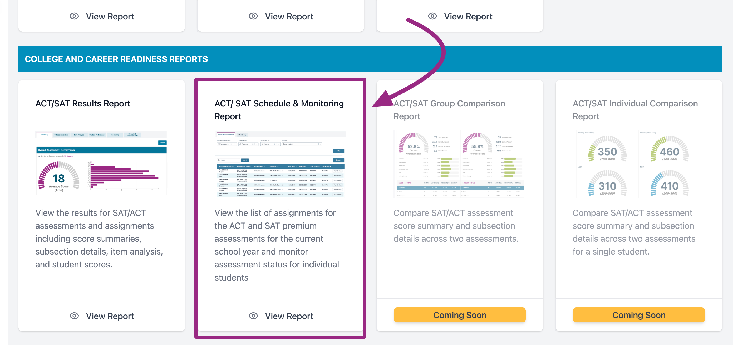 - From the College and Career Readiness report section, choose the ACT®/SAT® Scheduling and Monitoring Report