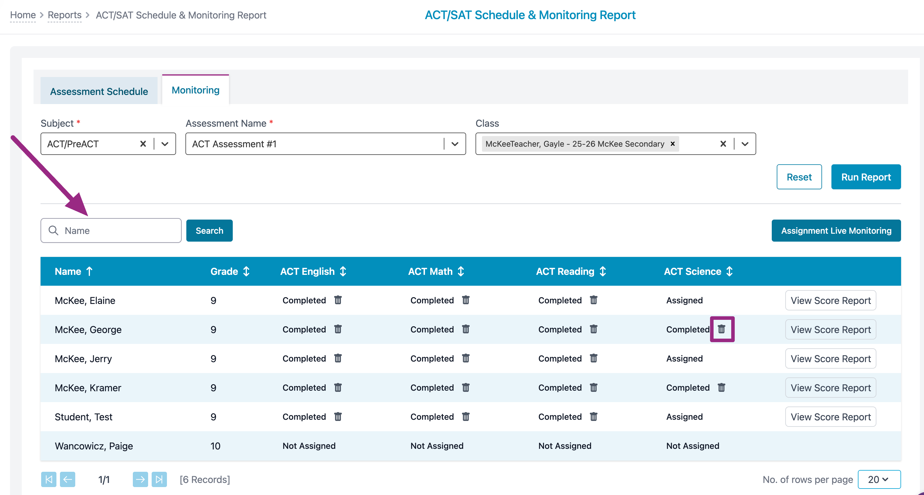 - You can search for a student by name or you can view all students in the selected class. Click on the trashcan icon to delete the test.