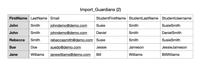 Ex: Guardian John Smith needs to be connected to Students Susie Smith and Daniel Smith. Your import sheet should have 2 rows containing John Smith's same information, along with Susie and Daniel's specific information.