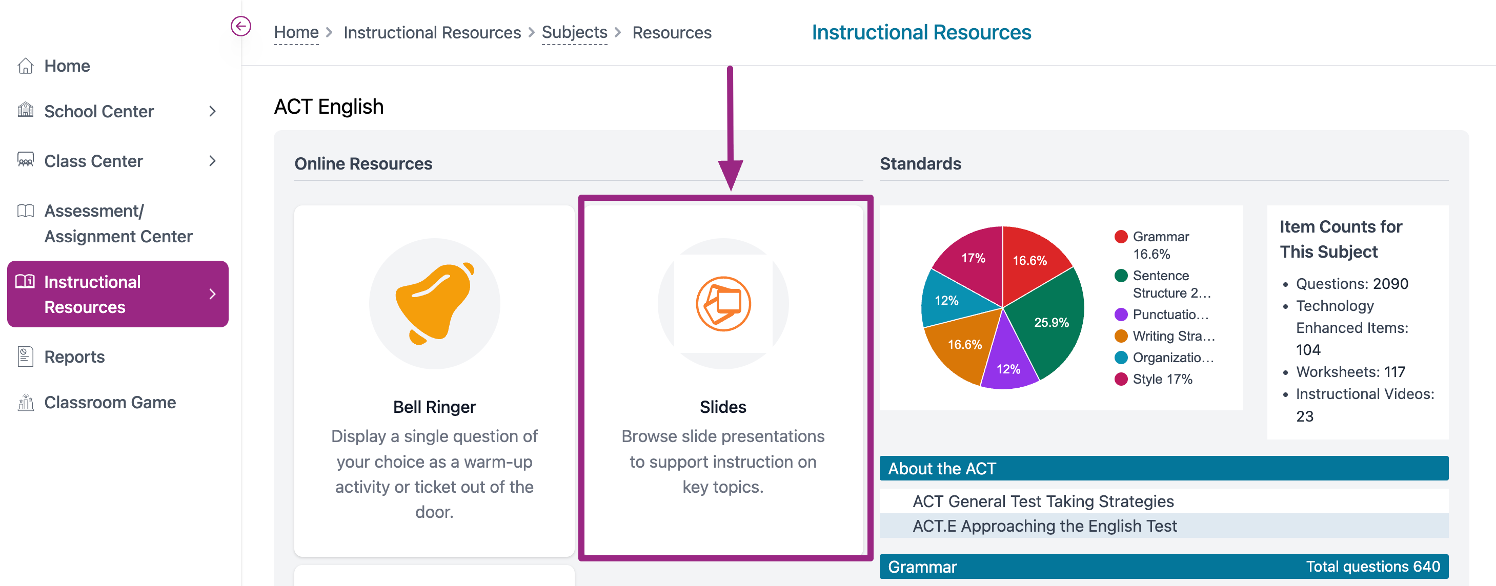 We have a libarary of ACT®/SAT® Coursework that you can use during whole group instruction or that you can assign to students. Students also have access to this coursework on their Individualized Study Plan.