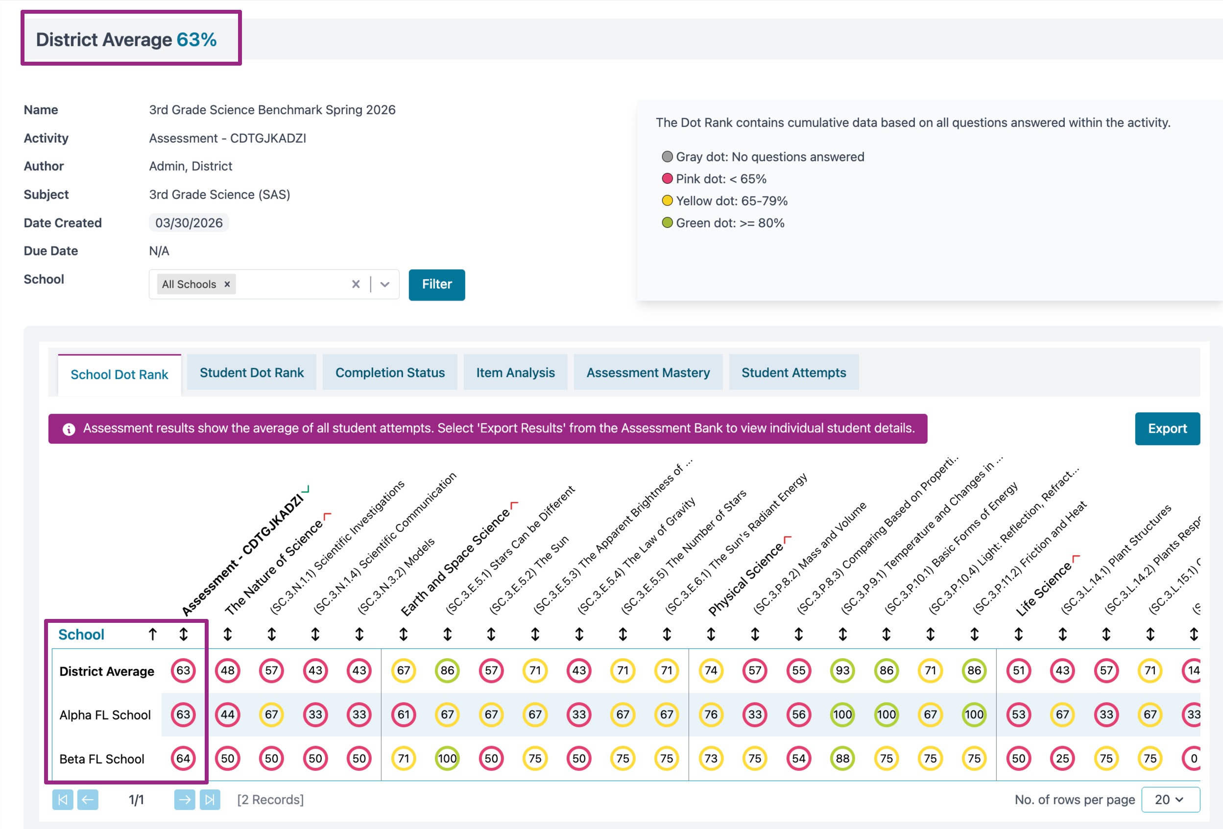 - School Dot Rank- Allows you to view the average score for the district and each campus. You are able to view results by Domain or by Standard. ** This report can be Exported.