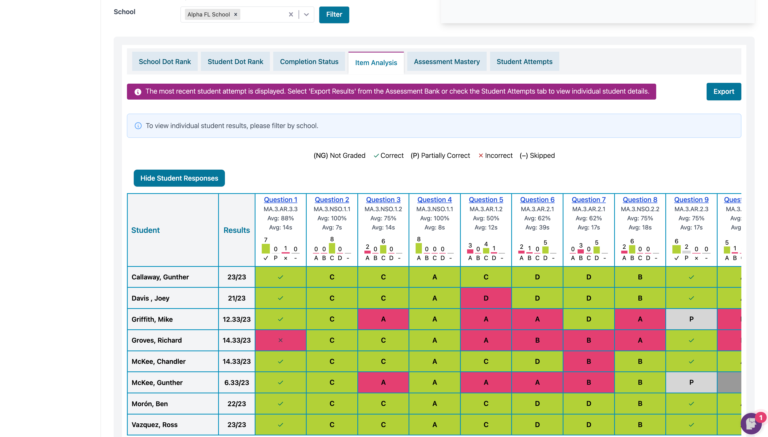- Student Dot Rank- Allows you to view results by each student on each standard assessed. You must use the drop down filter and choose one campus at a time to see individual students. ** This report can be Exported.