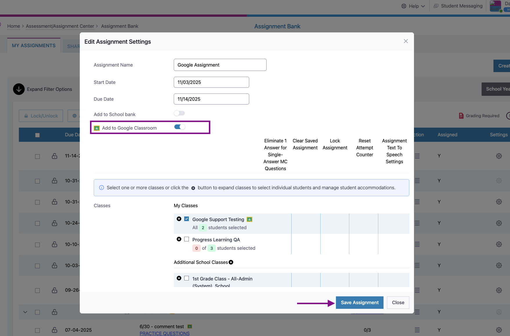 Step 4. If the existing assignment due date has passed, extend the due date to a future date. Enable the toggle next to Add to Google Classroom, then click Save Assignment.