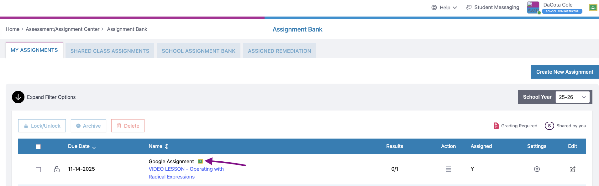 Step 5. On the Assignment Bank page, the assignment you synced will have a Google Classroom icon indicating the sync was successful.