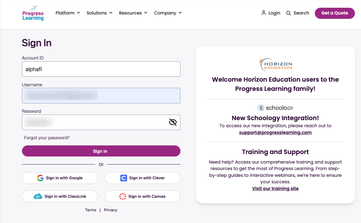 You will go to app.progresslearning.com to log in. Enter the Account ID, Username and Password from the previous step.