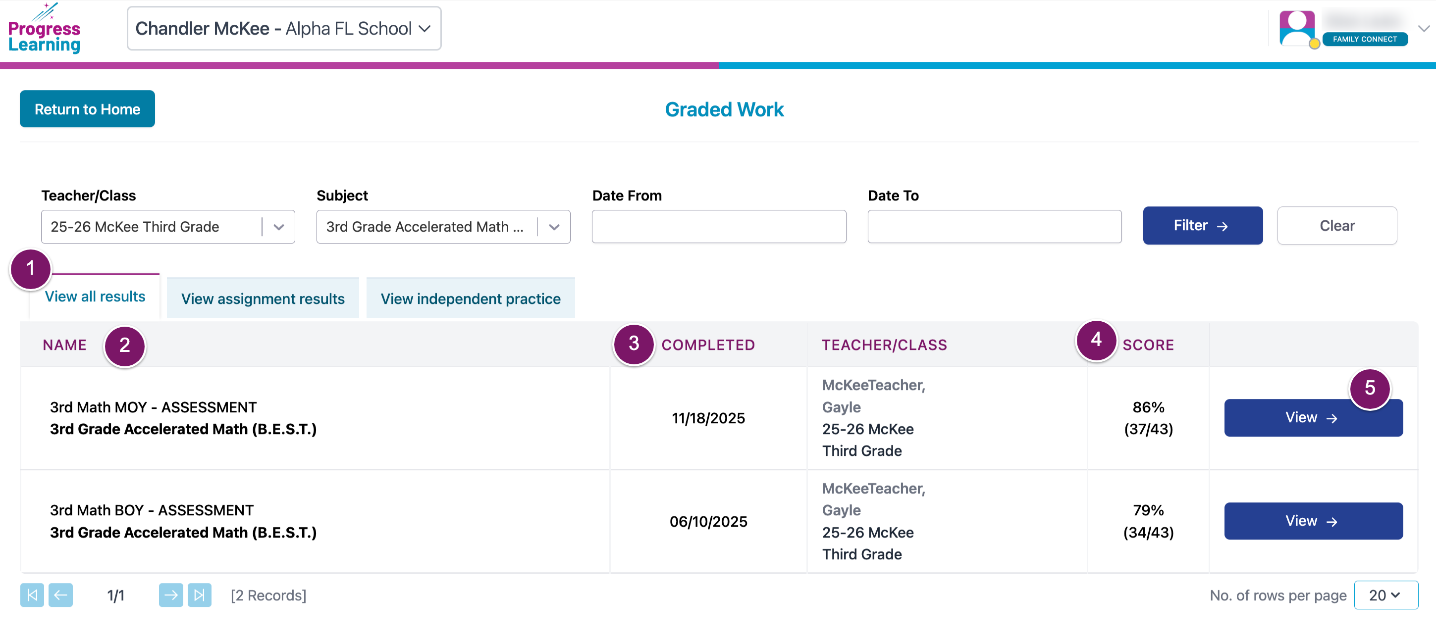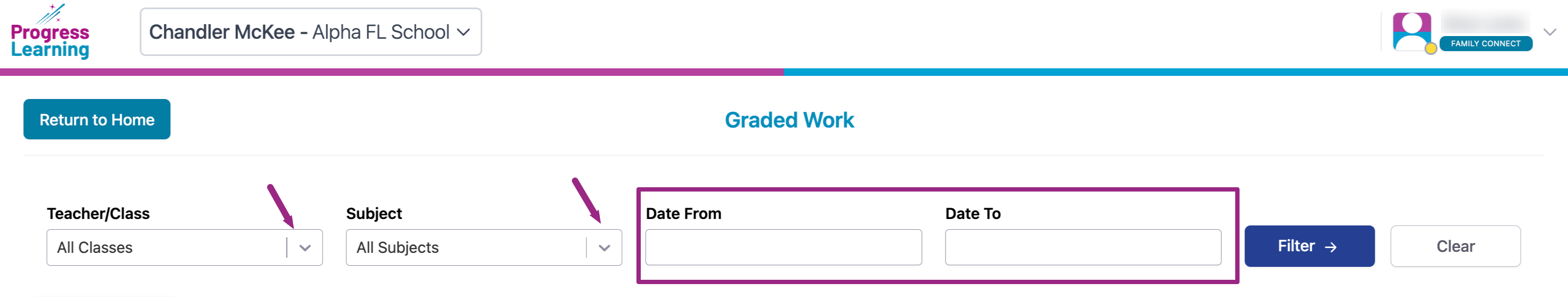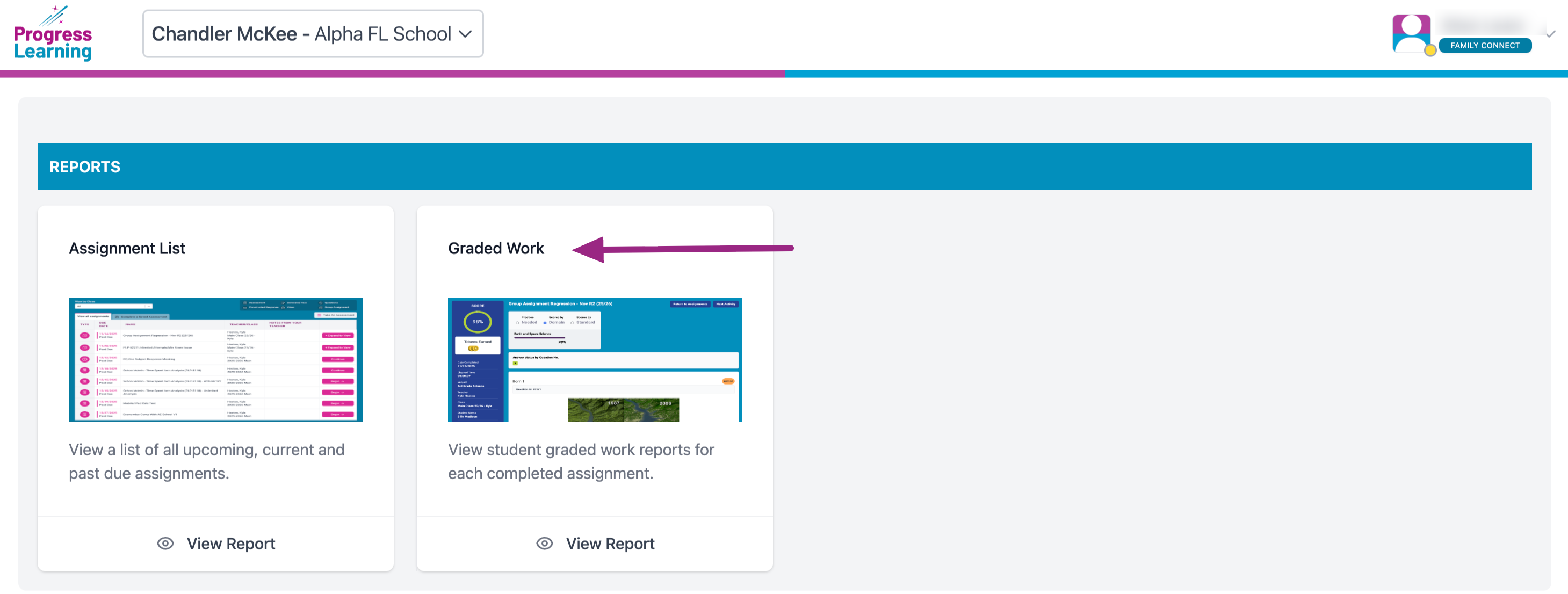 Back on your home screen, you also have the option to look at your student's Graded Work. This will include all activities that your student has completed and submitted in the Progress Learning platform.