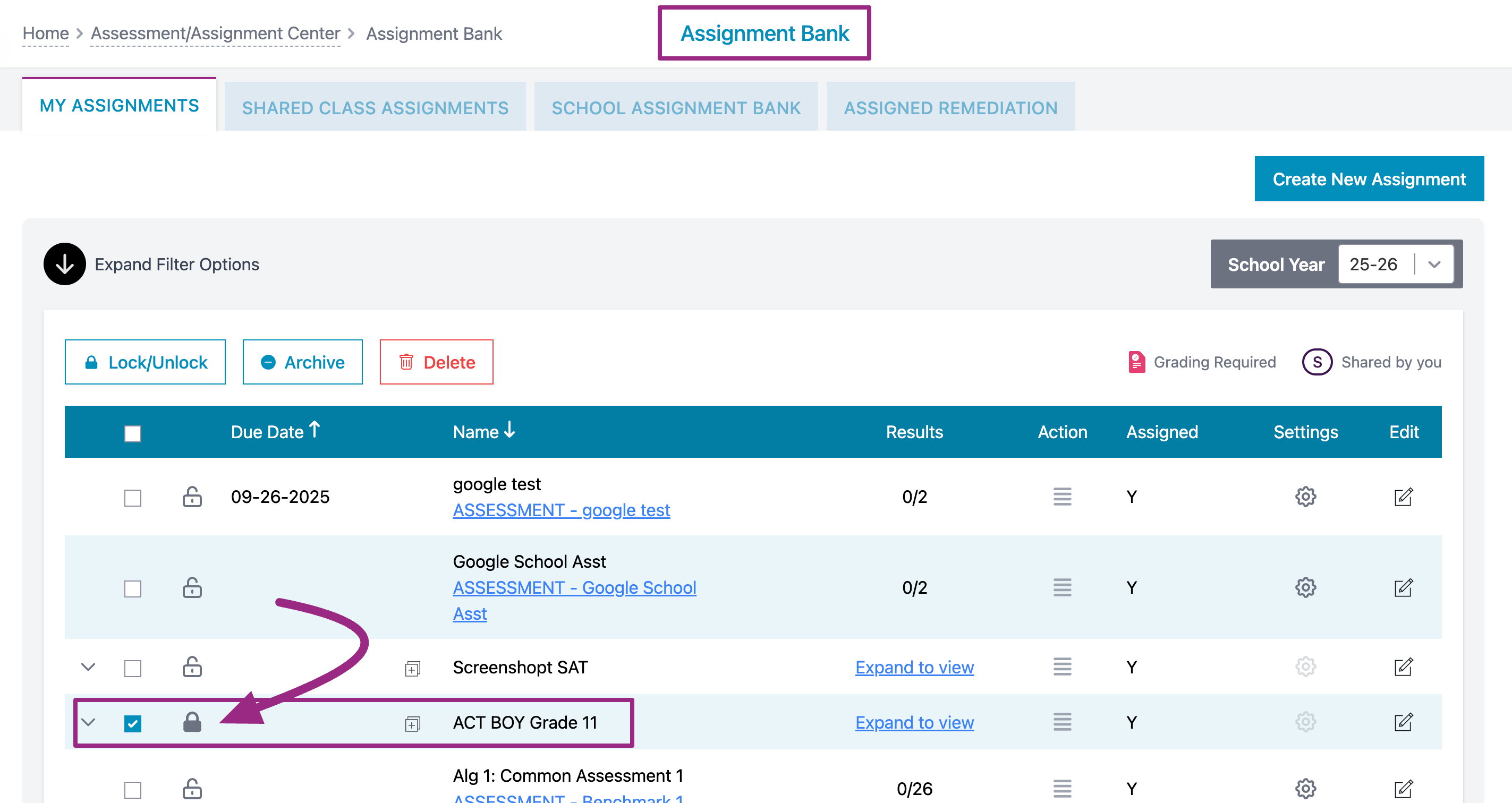 - School Administrators have the capability of locking assessments. This can be done in the Assessment Bank on the Premium Assessment tab. Click here to learn how to lock assessments.