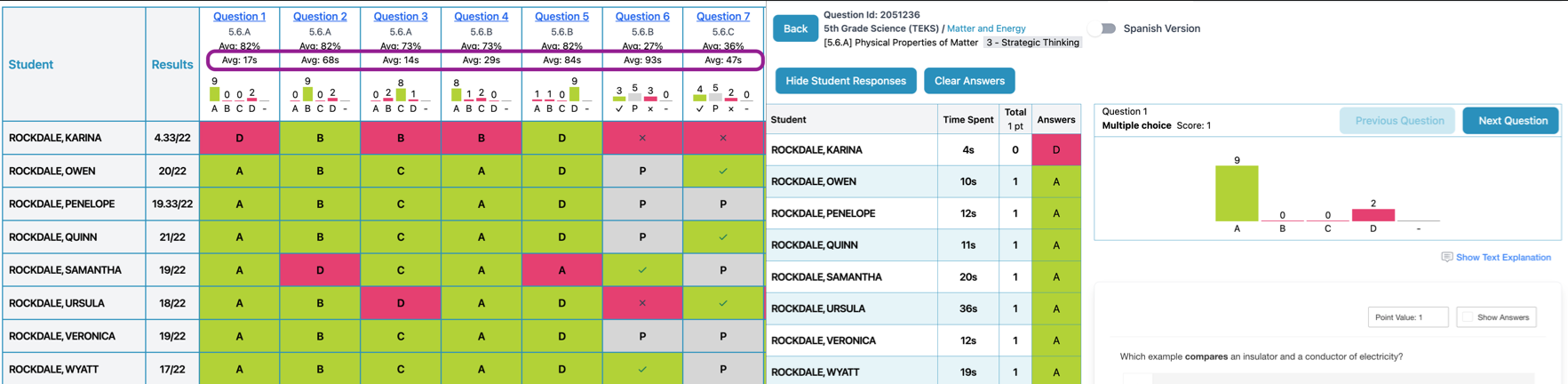We've included the Time Spent for each question in the Results Report's Item Analysis tab! You'll find the average time spent on each question displayed in the histogram, along with individual student times when you view the detailed question breakdown.