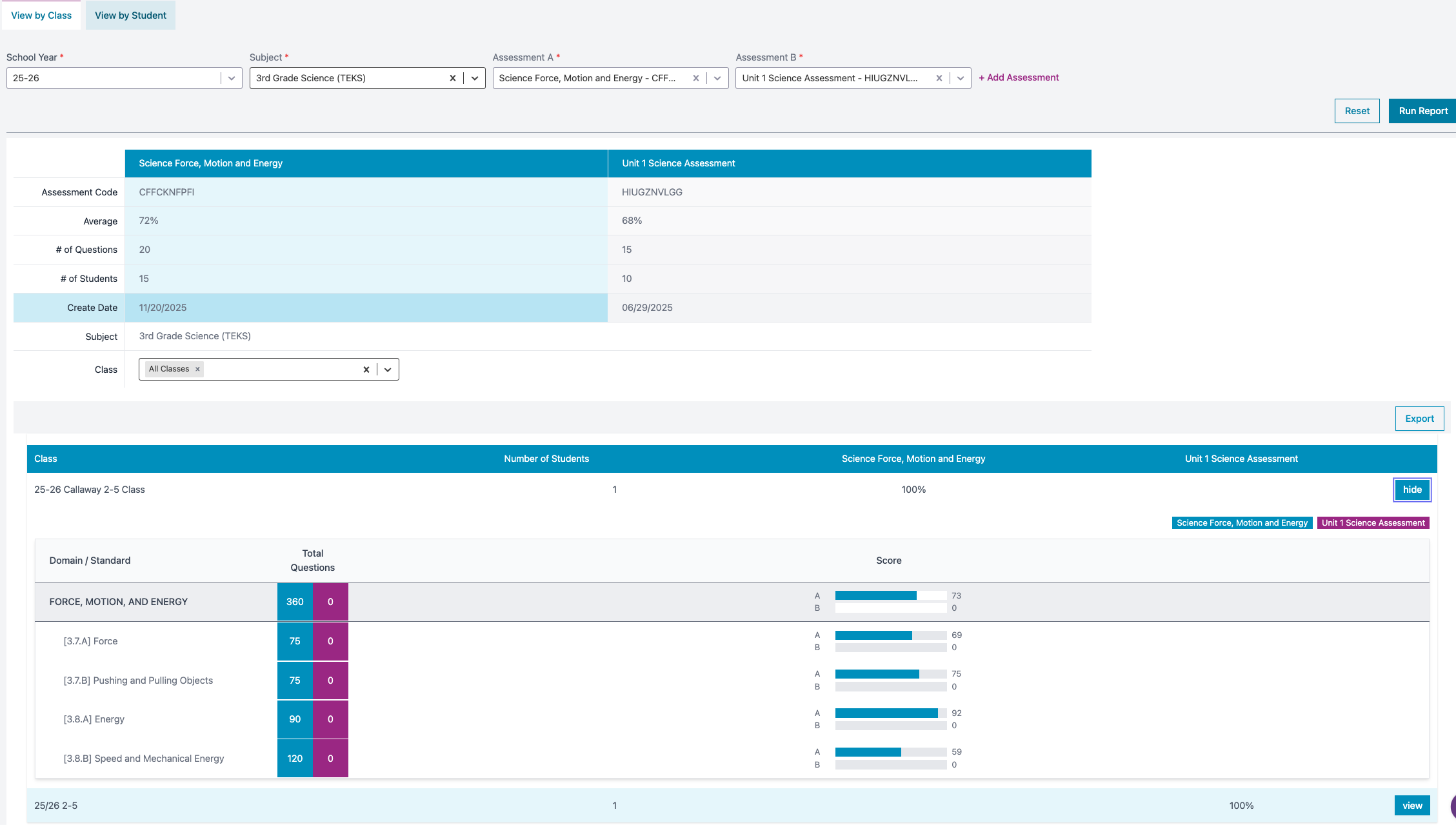 We have added two new tabs to the Assessment Comparison Report. View by School (District Admins) and View by Class (School Assessments - District Admin, School Admin, and Teachers). This makes it easier to view your comparison data between 2 or 3 assessments at a higher level by school or class!