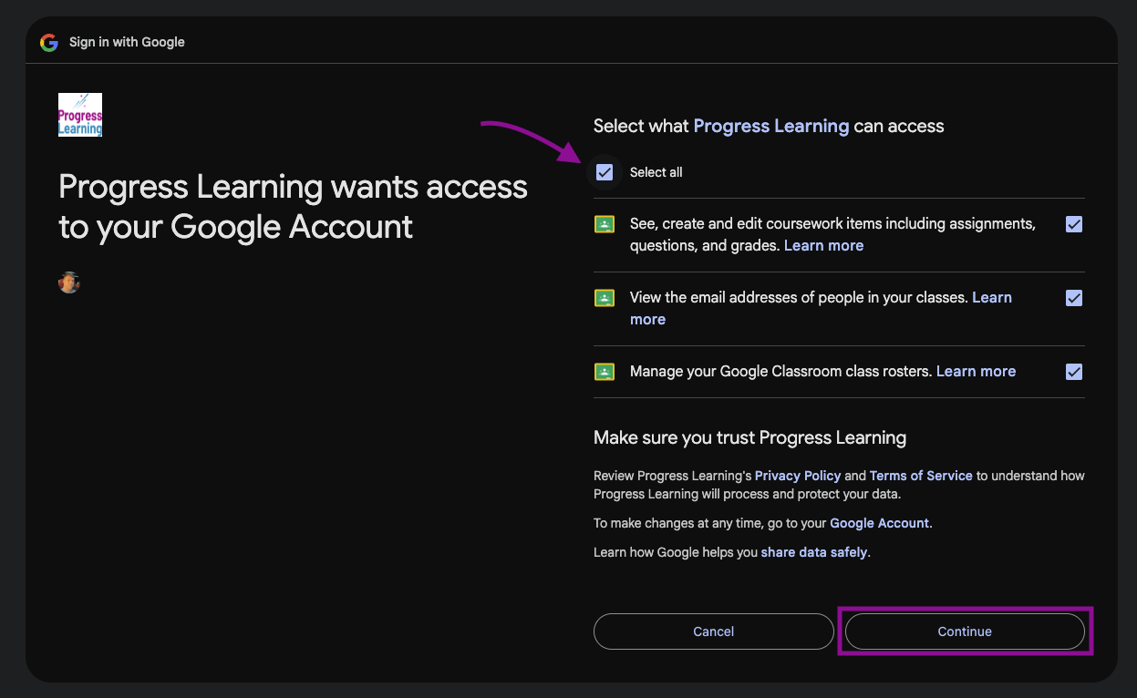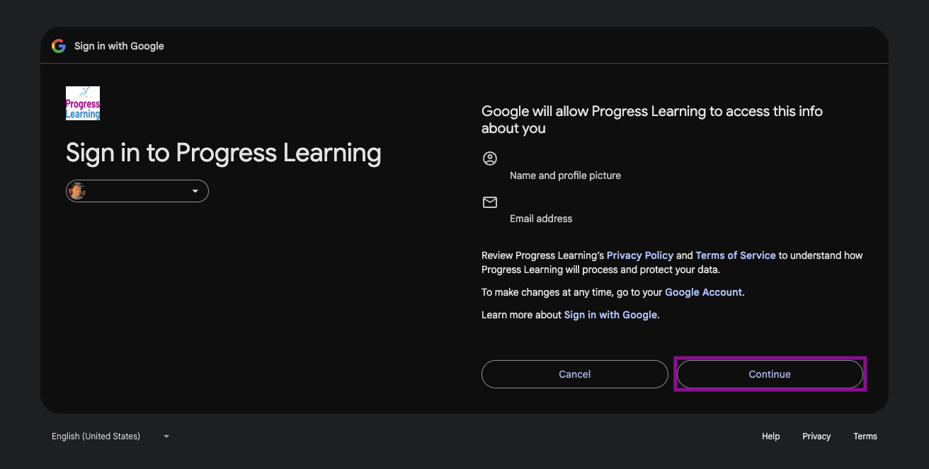 - You will be redirected to your dashboard, and in the future, you may log in with Google by selecting the Sign in with Google option at app.progresslearning.com/login.
