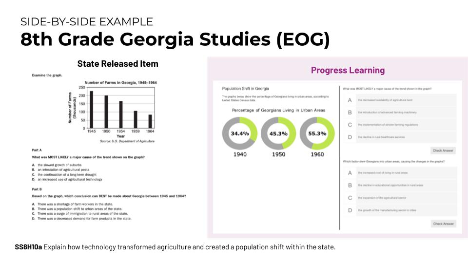 Progress Learning has online prep, practice assessments, and more to help elementary, middle, and high school students prepare for their Georgia Milestones exams. Our platform is fully aligned to new Georgia K-12 standards for ELA and Math, as well as GSE for science and social studies.