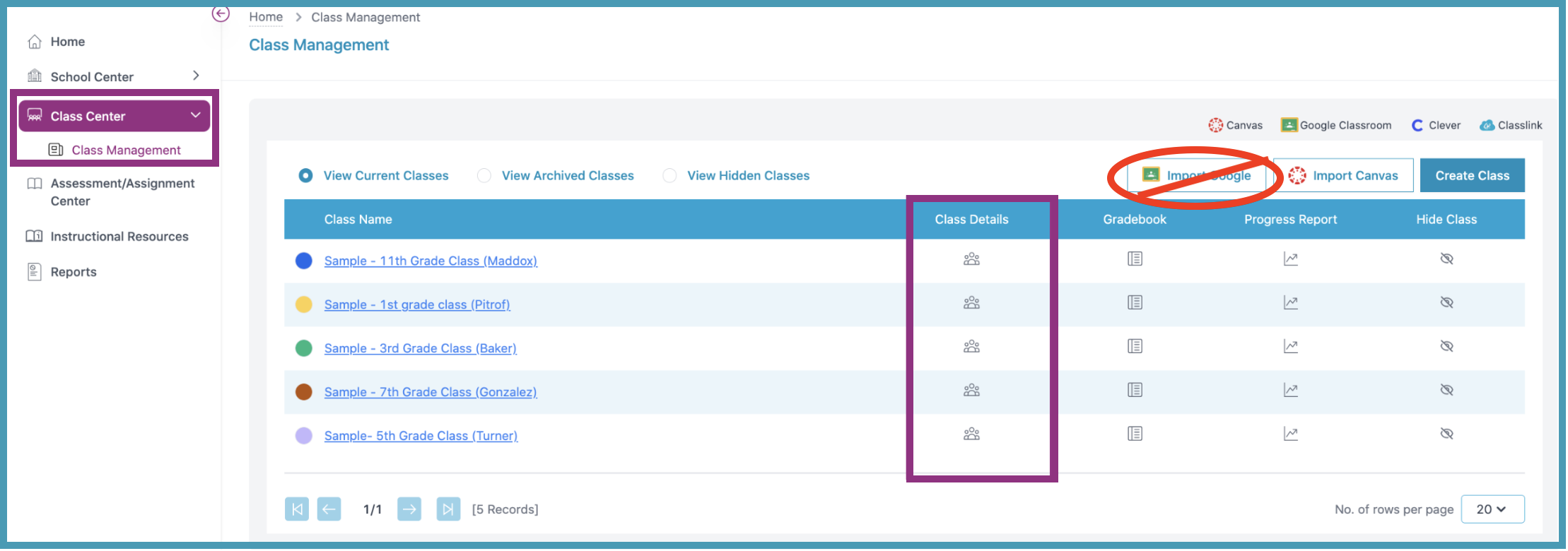 - From the teacher home page, select Class Center, then Class Management. You will then select Class Details for any of your classes you need to connect to Google Classroom.